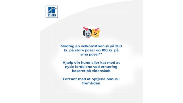 Indtil d. 30/6 kan du som ny Hill’s kunde spare kr. 100,- på poser under 5 kg og kr. 200,- på poser over 5 kg!
